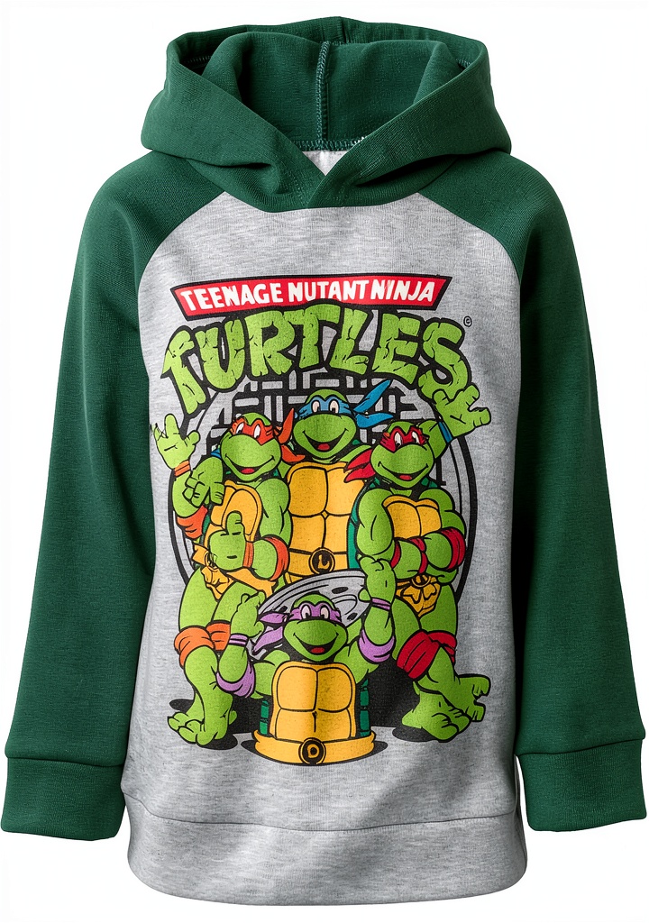 This officially licensed Teenage Mutant Ninja Turtles hoodie and pants set is designed for toddler boys, combining comfort, style, and durability. The set includes a long-sleeve graphic hooded sweatshirt with contrast raglan sleeves, ribbed waist and sleeve cuffs, a comfortable hood lining, and a soft hand screen print design. The matching pants feature ankle cuffs for a secure fit. Made from soft, safe materials that are gentle on children’s skin, this activewear ensures easy dressing and all-day comfort. Available in sizes from 2T to 14-16 and colors like Green/Gray, Teal, and Gray/Green, it’s manufactured by Bentex Group, Inc., with a high customer rating of 4.6 stars based on 483 reviews.